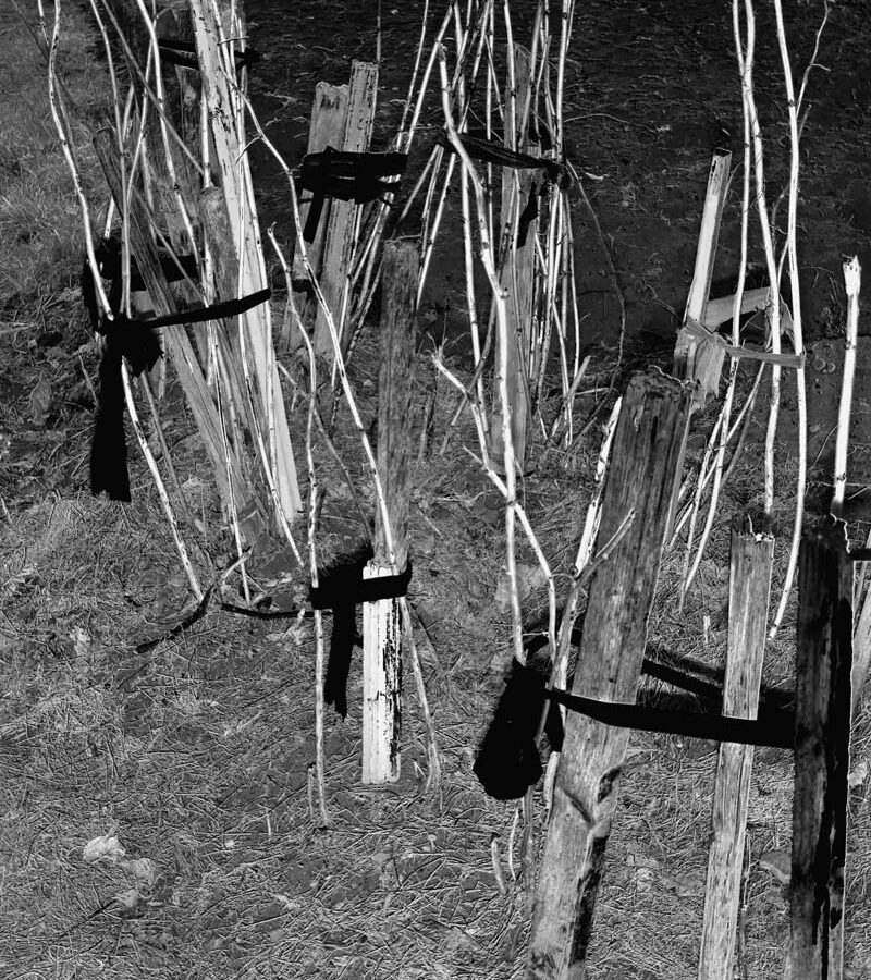 Ця тема, насправді, є чи не основною, коли йдеться про «крихкість». Зокрема їй присвячені цілі серії про тонкі саджанці, утримувані перев’язками та опорами. Наприклад, «Етюди/Дослідження крихкості» Каріни Синиці, серія «Ламкість» Елени Субач, «Квір-Садиба» Саші Курмаза тощо. Багато авторів фактично тиражують зображення ламких тіл у вигляді дерев або ж людських фігур, які без підтримок просто розпадуться і зламаються остаточно. Утім, ці підтримки лише фіксують стан, в якому тіла ніби зависають над землею, зберігаючи при цьому постійний імпульс тяжіння донизу, до землі. Саме тому крихкість і є гробницею, достатньо комфортною для застрягання в інертному стані. Разом із тим, я вбачаю цю інертність дуже романтичною у тому сенсі, що вона постійно апелює до чуттєвості глядача. Наприклад, робота демонструє мені розгортання чужої трагедії: жіноче тіло, перев’язане, ніби жертовне ягня15, або ж тонка осика, яка тримається за рахунок інших дерев’яних підпорок16.