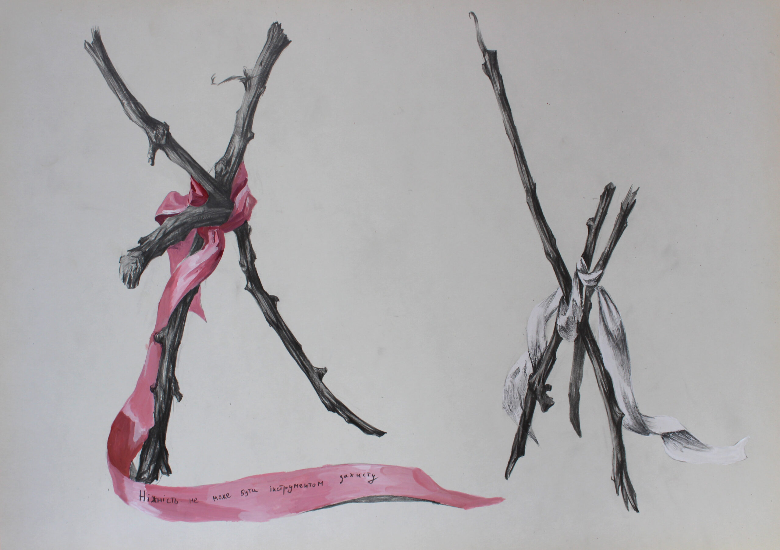 Це лише зайвий раз нагадує, що синонімом крихкості є кволість та хворобливість18, справжні або ж рукотворні, вигадані. При цьому, існує певна тенденція асоціювати (плутати) крихкість із ніжністю19. Зокрема, одна з робіт Синиці, що зображає сухі тонкі гілки, перев’язані рожевою стрічкою, називається «Ніжність не може бути захистом»20.
